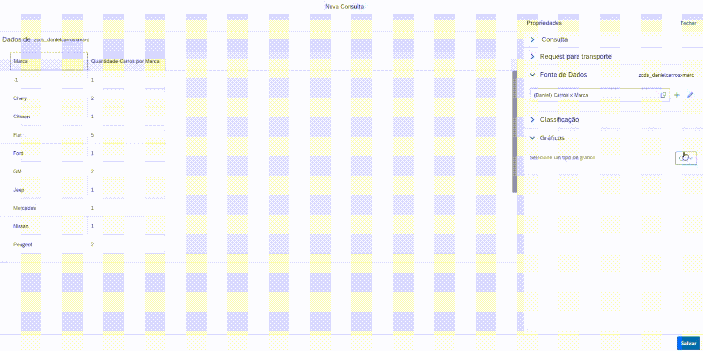 Os gráficos de barras são úteis porque tornam fácil visualizar e comparar valores de diferentes categorias de forma clara e intuitiva. No exemplo a seguir, veremos a construção de um gráfico de barras que utiliza uma fonte de dados com informações de quantidade de carros por marca: