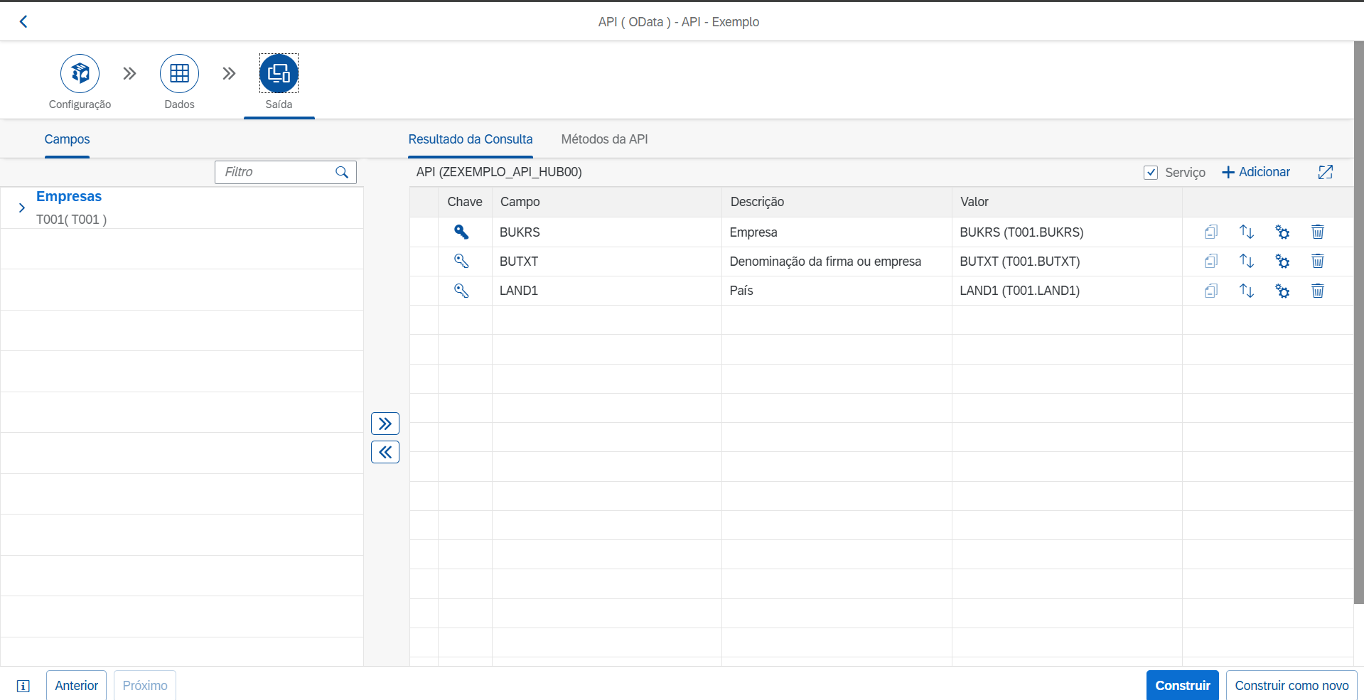 Depois de escolher a fonte, marque os campos que serão expostos pela API (por exemplo, MANDT, LIFNR, BUKRS, BELNR, etc).