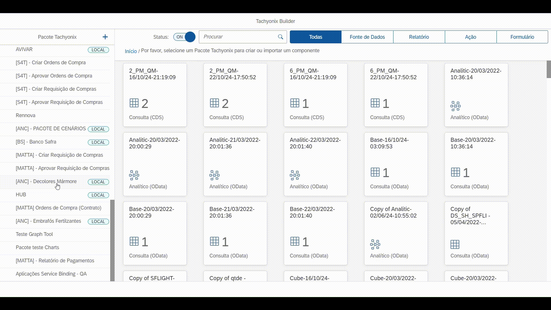 Na tela inicial do Tachyonix Builder, selecione o pacote desejado. Em seguida, clique em Novo e escolha o tipo Relatório. Informe o nome e a descrição da aplicação. Caso necessário, defina também o nome da request ou o pacote onde a aplicação será criada.