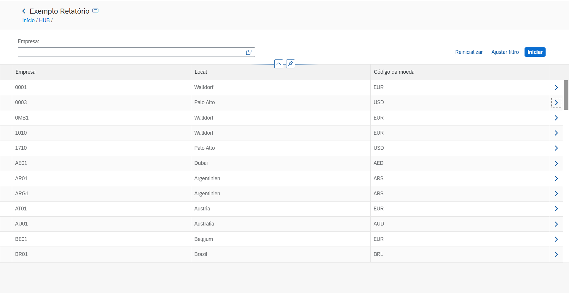 Nesta visualização, o relatório exibirá os campos selecionados da tabela T001, com a
