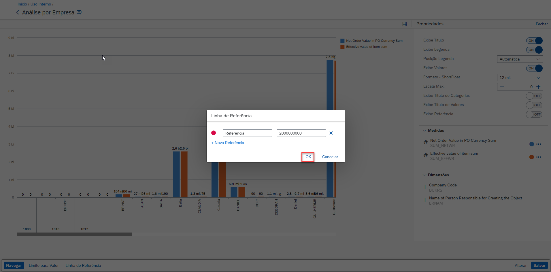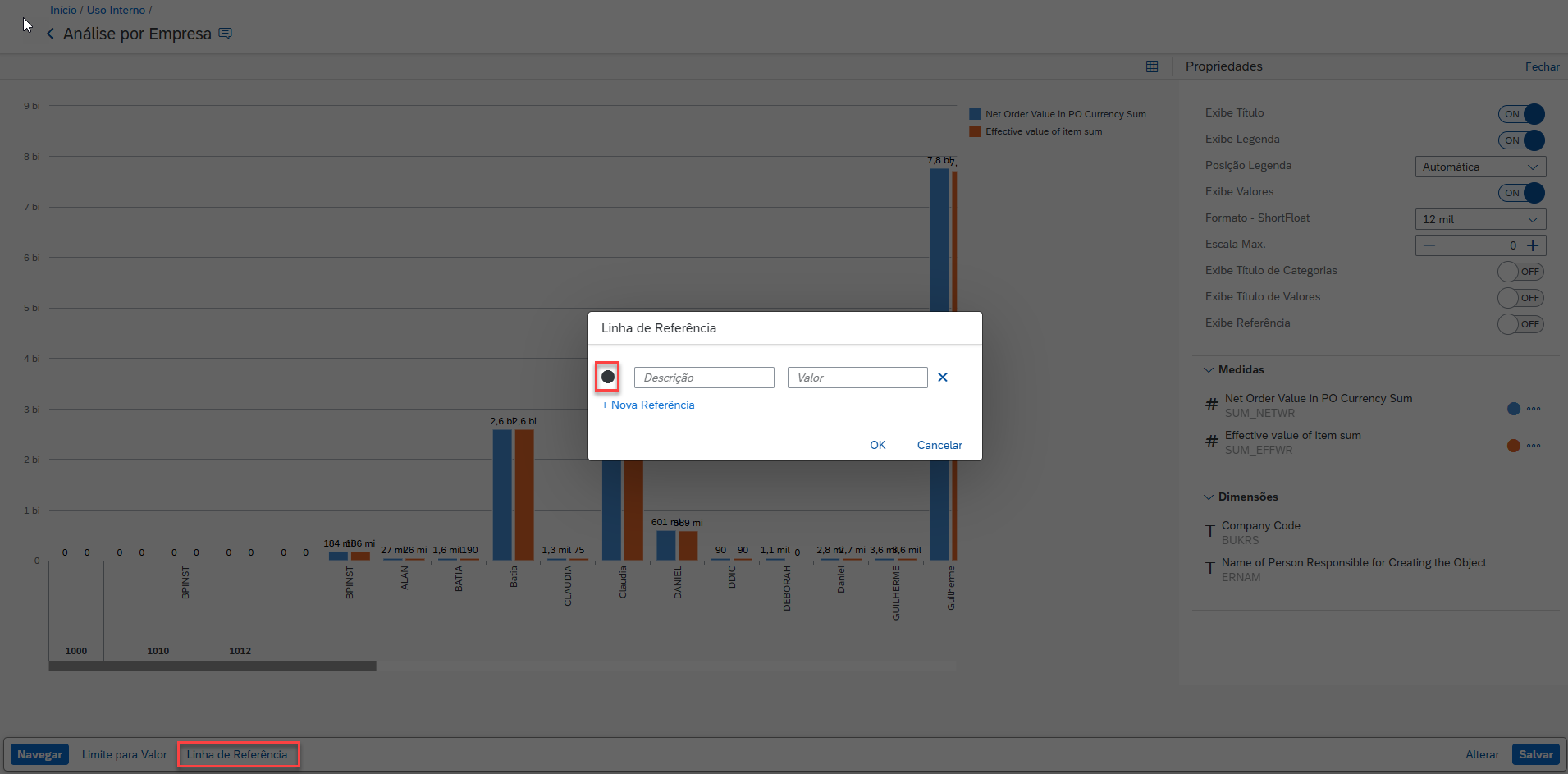 Clique no botão “Linha de Referência” e informe a descrição e valor. Também é possível definir uma cor personalizada para referência clicando sobre o círculo preto ao lado da descrição