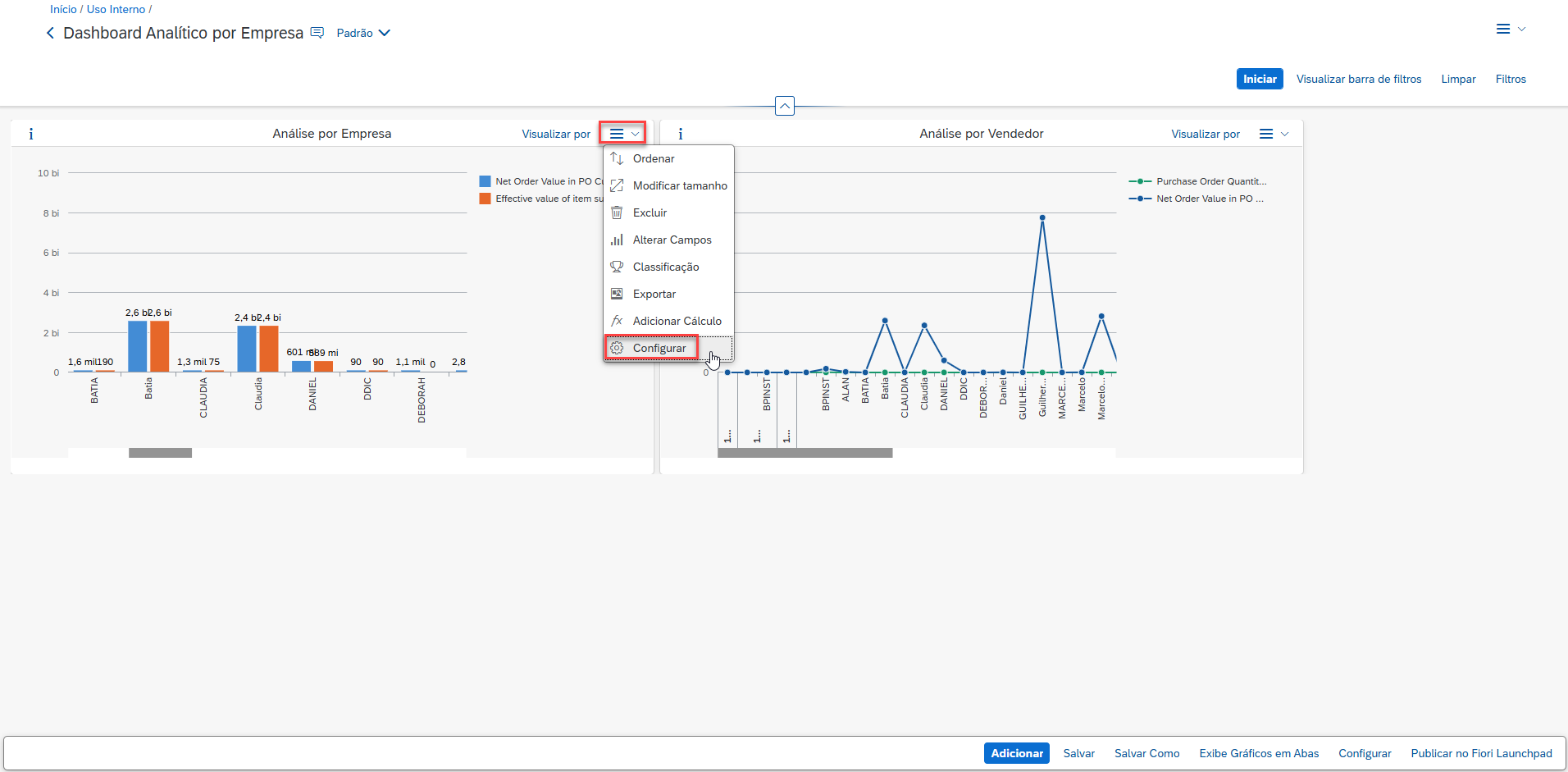 O dashboard será exibido, então clique no ícone sanduíche no gráfico e selecione a opção “Configurar”