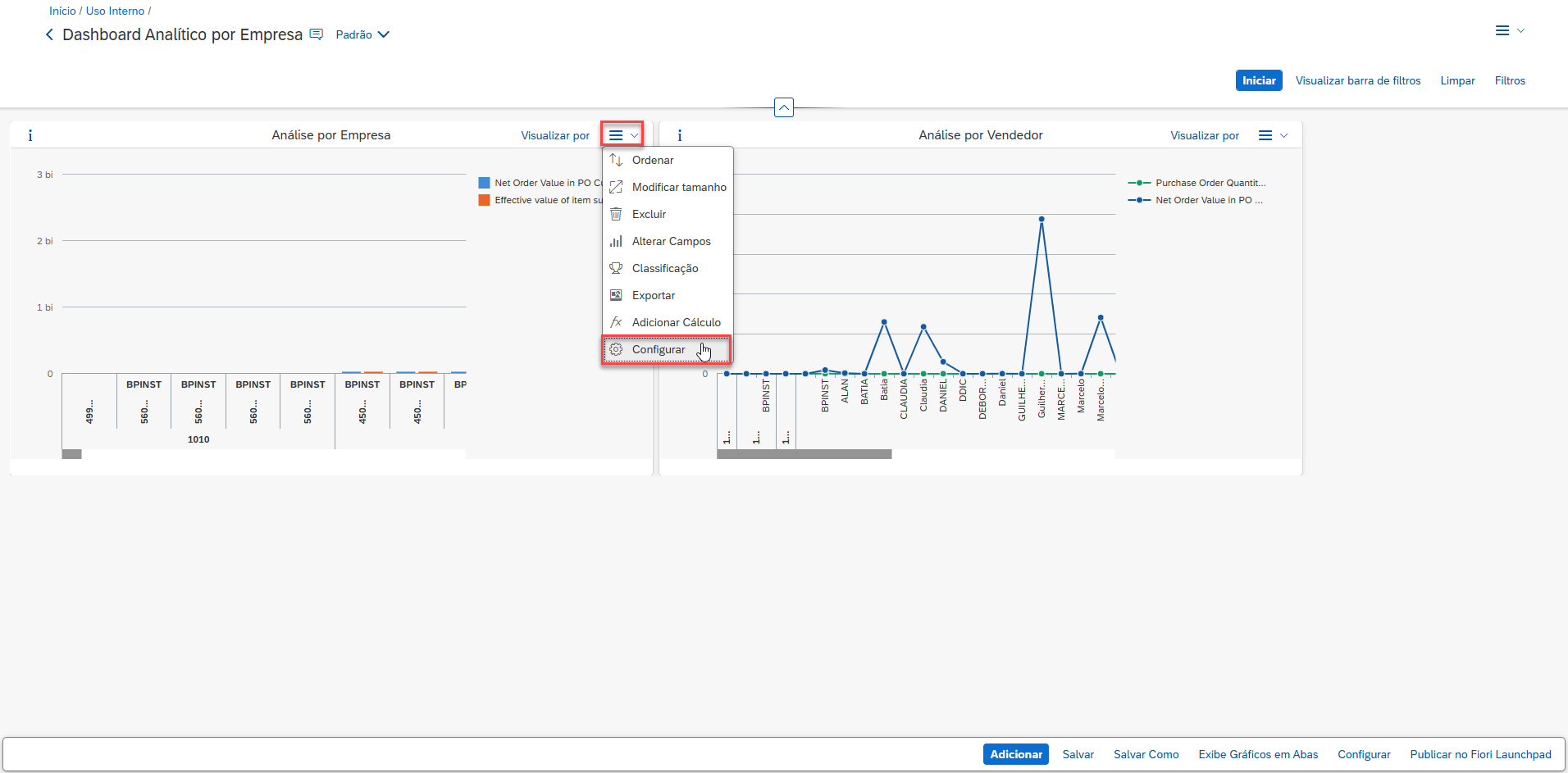 O dashboard será exibido, então clique no ícone sanduíche do gráfico que deseja configurar a navegação, em seguida em “Configurar”