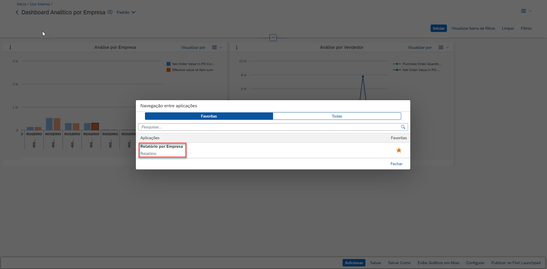 Na aba “Todas” são exibidas, além das favoritas, outros dashboards analíticos, dashboards transacionais ou storyboards que tenham campos em comum com o gráfico selecionado. Para esses casos não é necessário configurar a navegação. A ferramenta disponibiliza essas opções para navegação automaticamente.