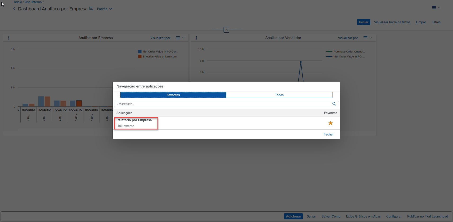 Na aba “Todas” são exibidas, além das favoritas, outros dashboards analíticos, dashboards transacionais ou storyboards que tenham campos em comum com o gráfico selecionado. Para esses casos não é necessário configurar a navegação. A ferramenta disponibiliza essas opções para navegação automaticamente.