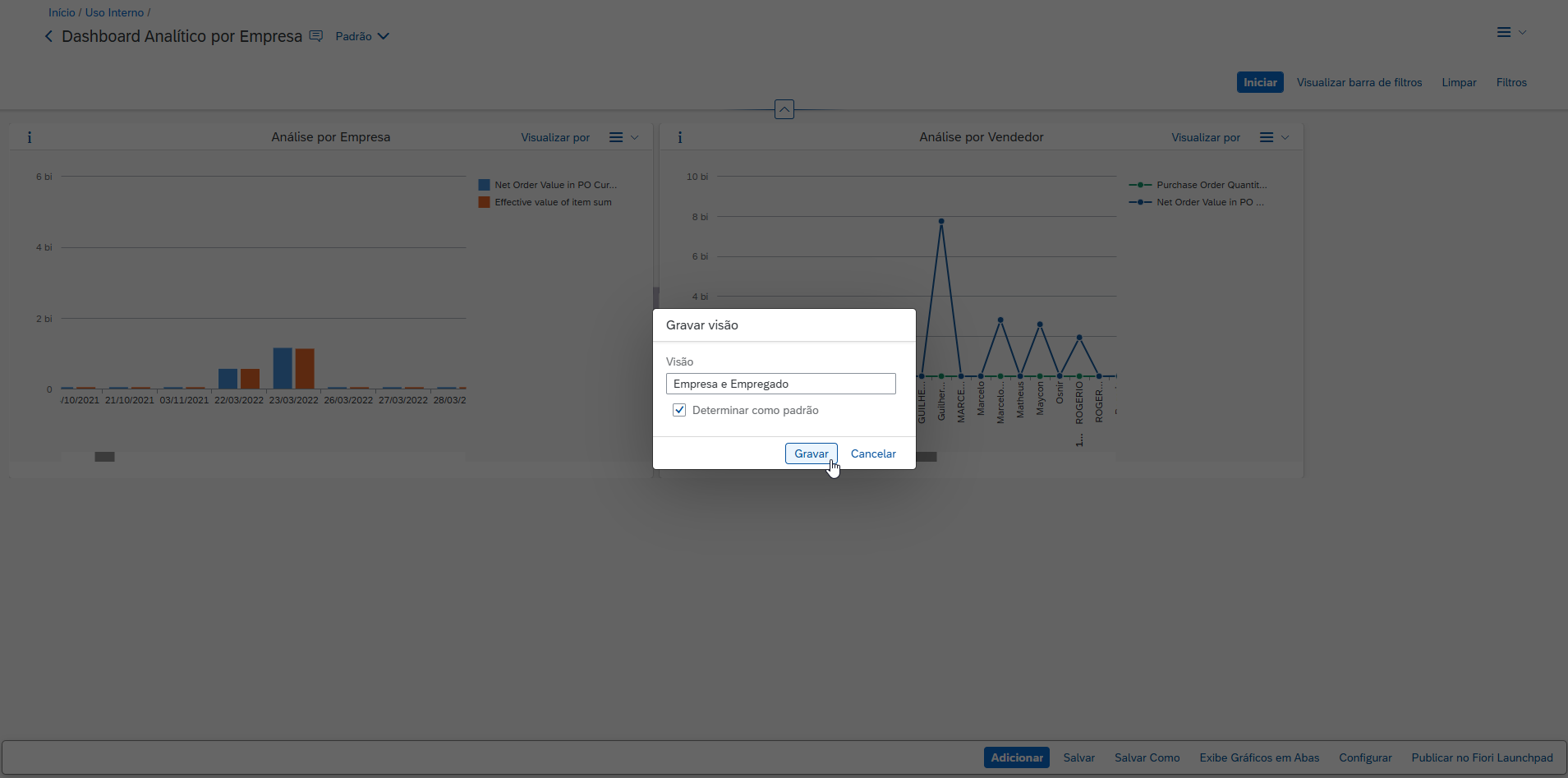 Preencha os filtros desejados, em seguida clique em “Padrão” e depois em “Gravar Como”. Informe um nome para variante. Caso deseje que os filtros informados sejam aplicados sempre que abrir o dashboard, então marque a opção “Determinar como padrão”.