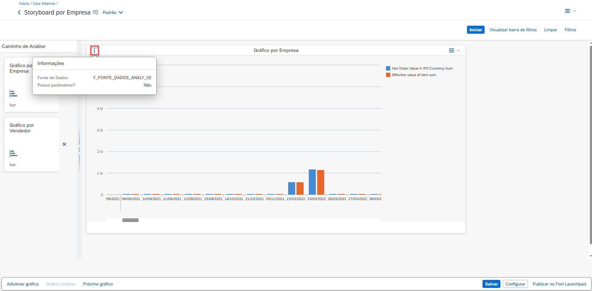 O ícone “i” presente no gráfico exibe as seguintes informações: Objeto de autorização, quando existir, fonte de dados e se o gráfico possui parâmetros