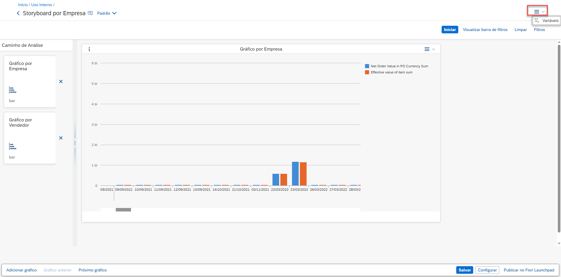O ícone sanduíche, presente no lado direito superior da tela, é utilizado para definição de variáveis para filtro, e também manipulação de parâmetros, quando a fonte de dados possuir