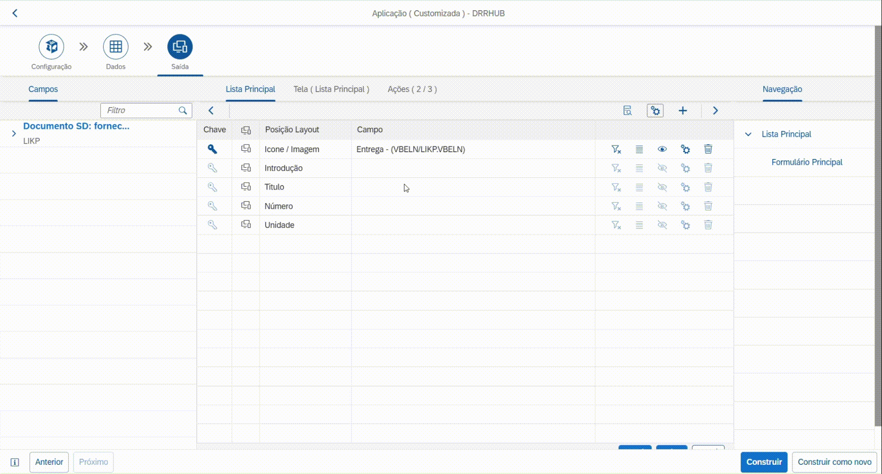 - Abra a subseção Lista Principal, Tela (Lista Principal) ou Ações da etapa Saída;