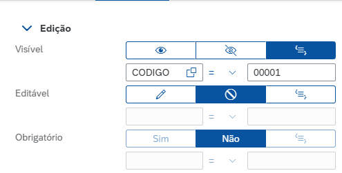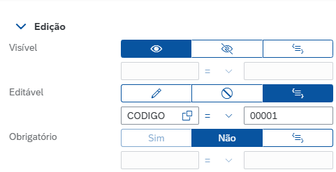 Exemplo: O campo "Descrição" só pode ser editado se o Código for igual a "00001". Se o Código for diferente, a descrição fica bloqueada.